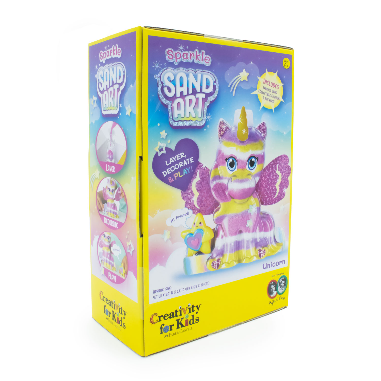 Figura de plástico transparente en forma de unicornio que los y las niñas deberán rellenar con la arena y brillos de colores por capas para darle su propia personalidad. Podrán decorar con las calcomanías incluidas, en el área que más les guste y con ello terminar de darle su propio toque.